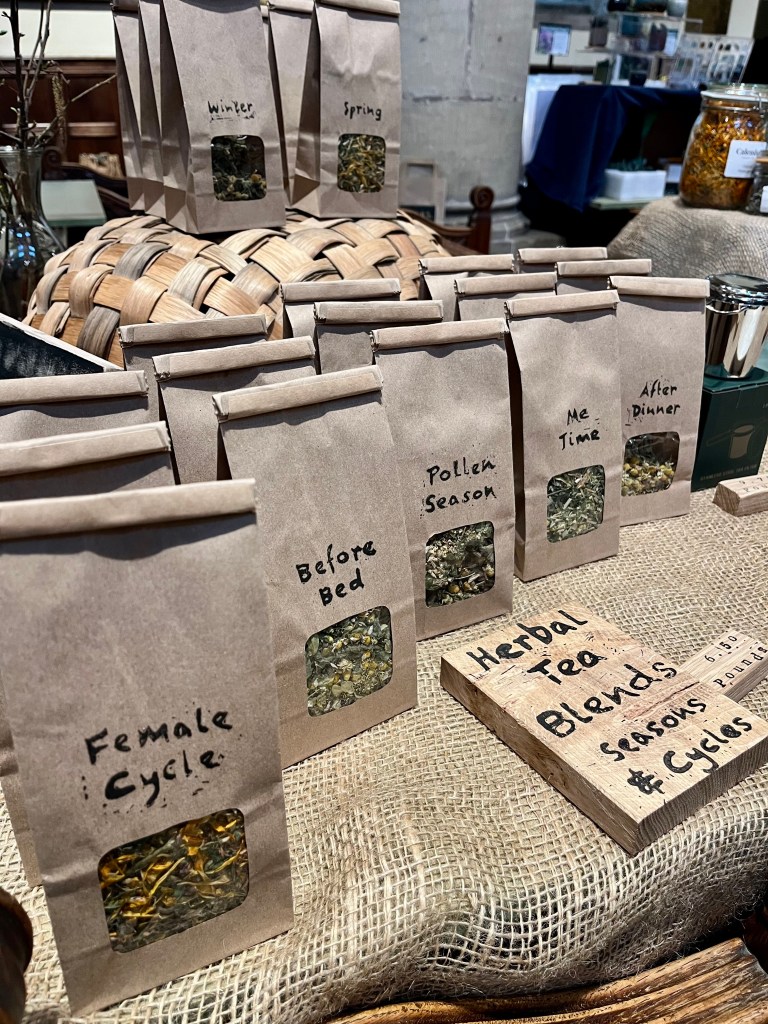 I attend a variety of local events selling herbal teas (single herbs and blends) and medicinal herb plants. The teas are blended to support the seasons and cycles of life and, where possible, I grow the herbs for them.